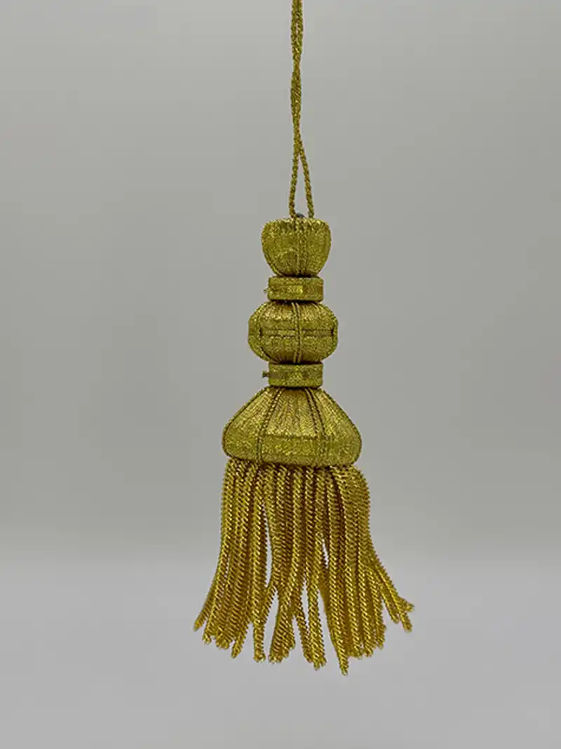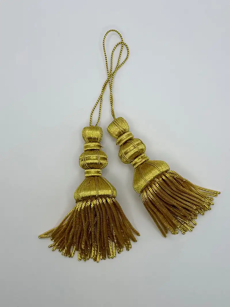 Los flecos miden 5cm, realizados en hilo de oro, con torsión que crea un bucle en forma de canutillo.