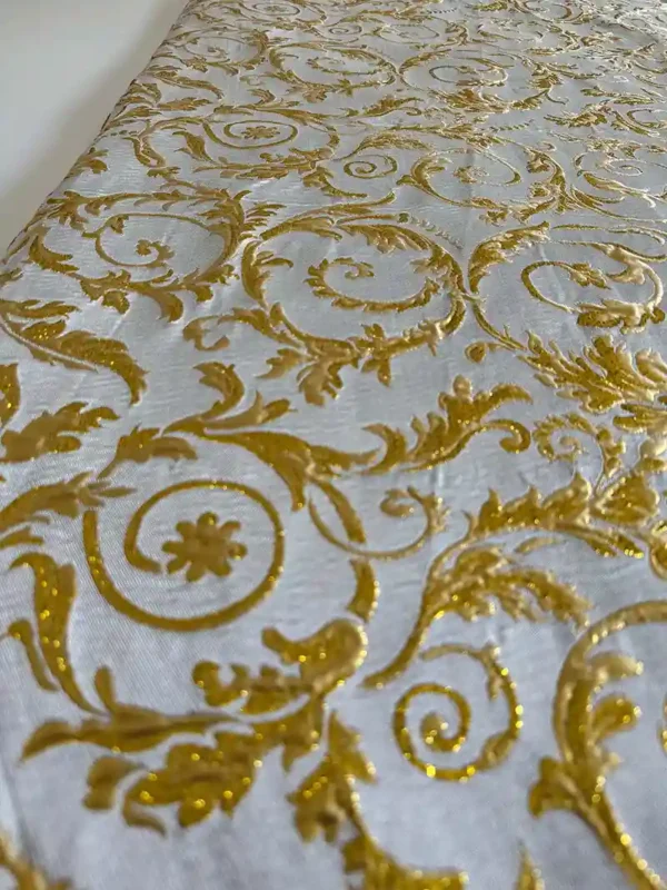 Nuestro brocado blanco Victoria es originalidad floral con dorado imperial.