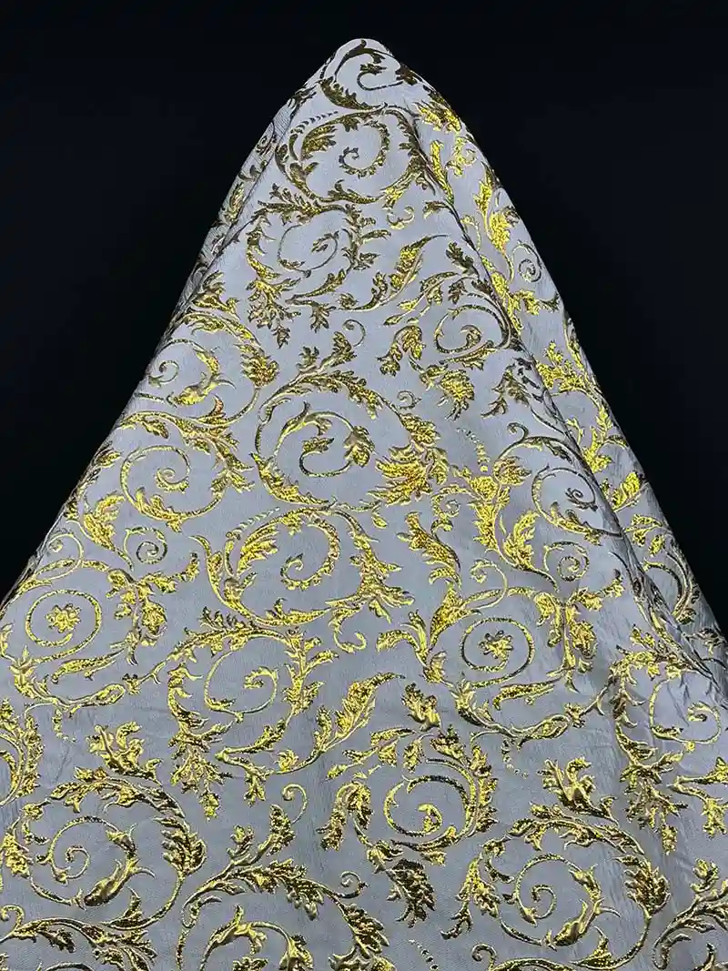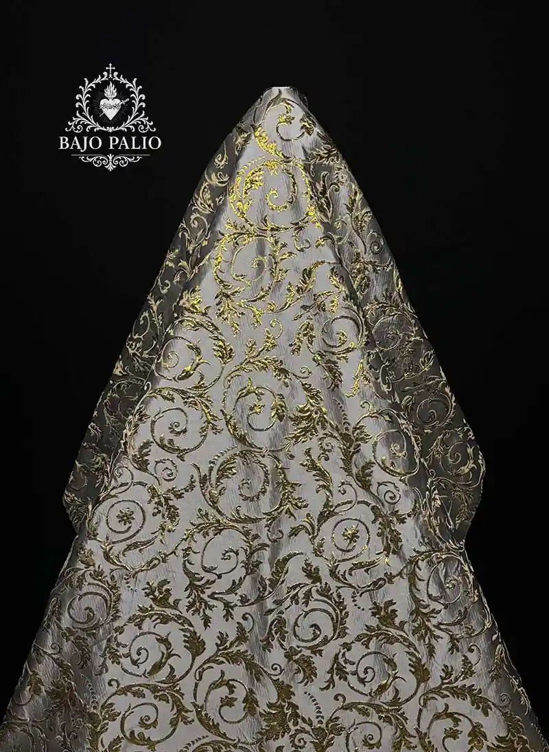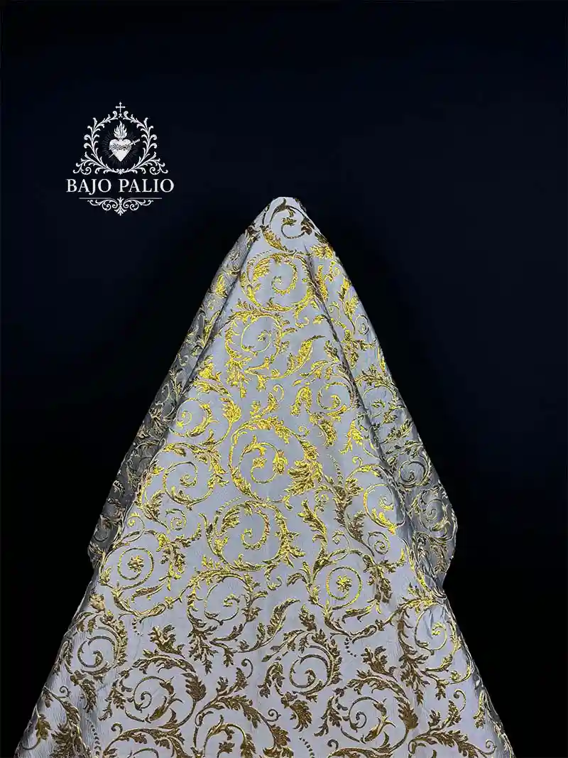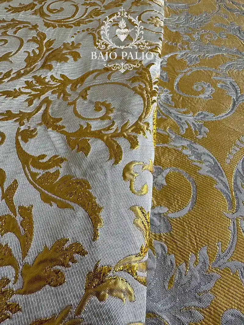 Este brocado destaca por su originalidad: la ornamentación floral crea formas circulares con las hojas, generando un patrón que funciona tanto para mantos como para túnicas. La clave está en sus dos tonalidades de hilo metálico dorado que te permiten coordinar perfectamente con tu orfebrería.