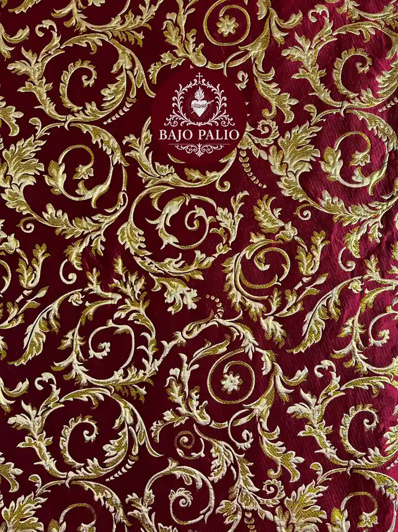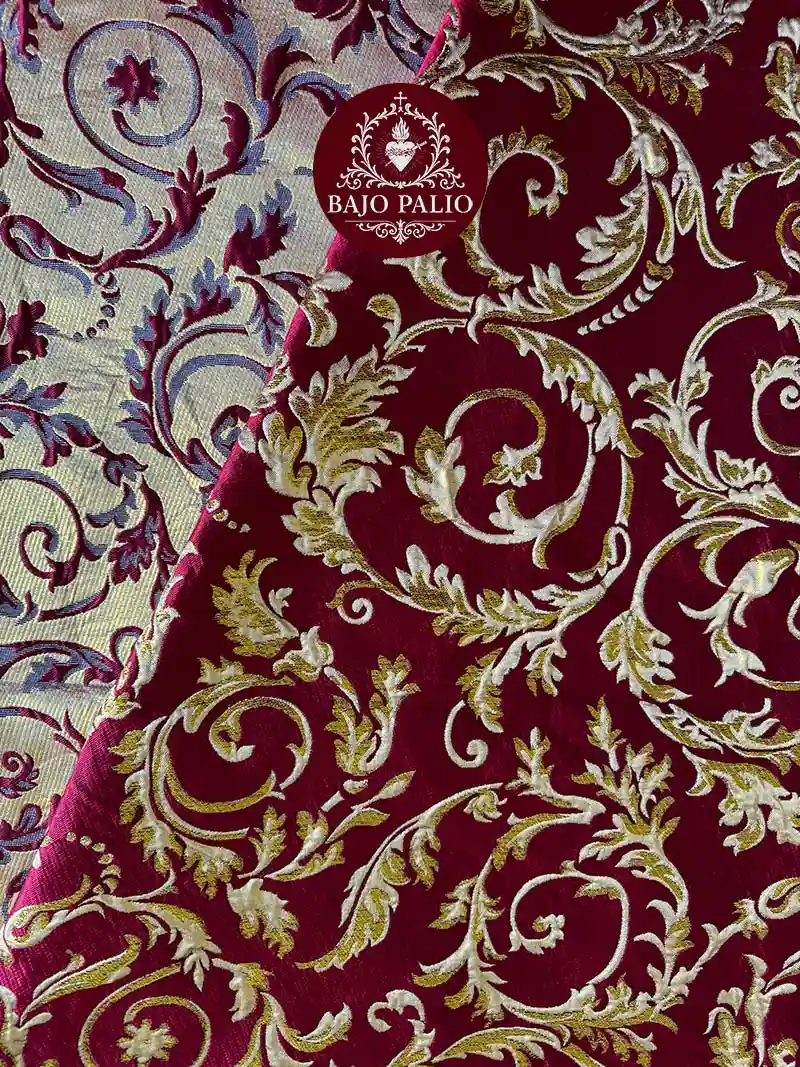 Este brocado destaca por su originalidad: la ornamentación floral crea formas circulares con las hojas, generando un patrón que funciona tanto para mantos como para túnicas. La clave está en sus dos tonalidades de hilo metálico dorado que te permiten coordinar perfectamente con tu orfebrería.