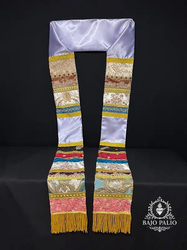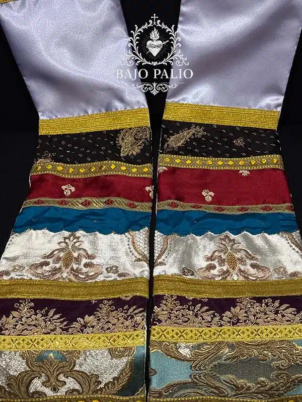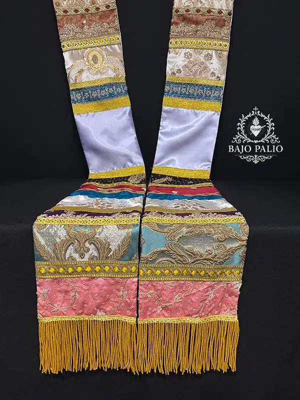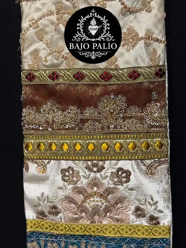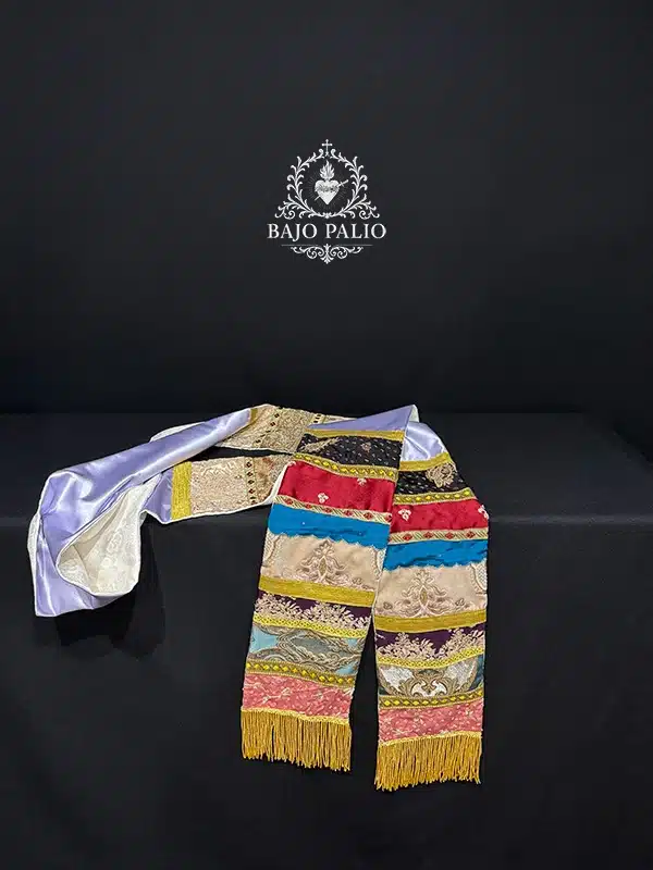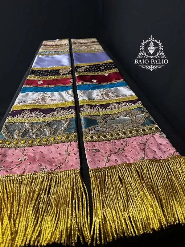 Rico fajín elaborado por registros, compuesto por variedad de piezas de canutillo dorado, brocados y terciopelos. Rematados por diferentes tipos de galones y fleco de oro fino.
