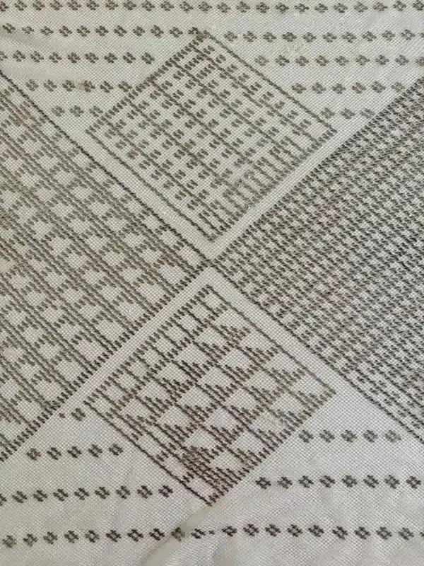 Cada rombo tiene su propio diseño geométrico interior, todo bordado en hojilla de plata.