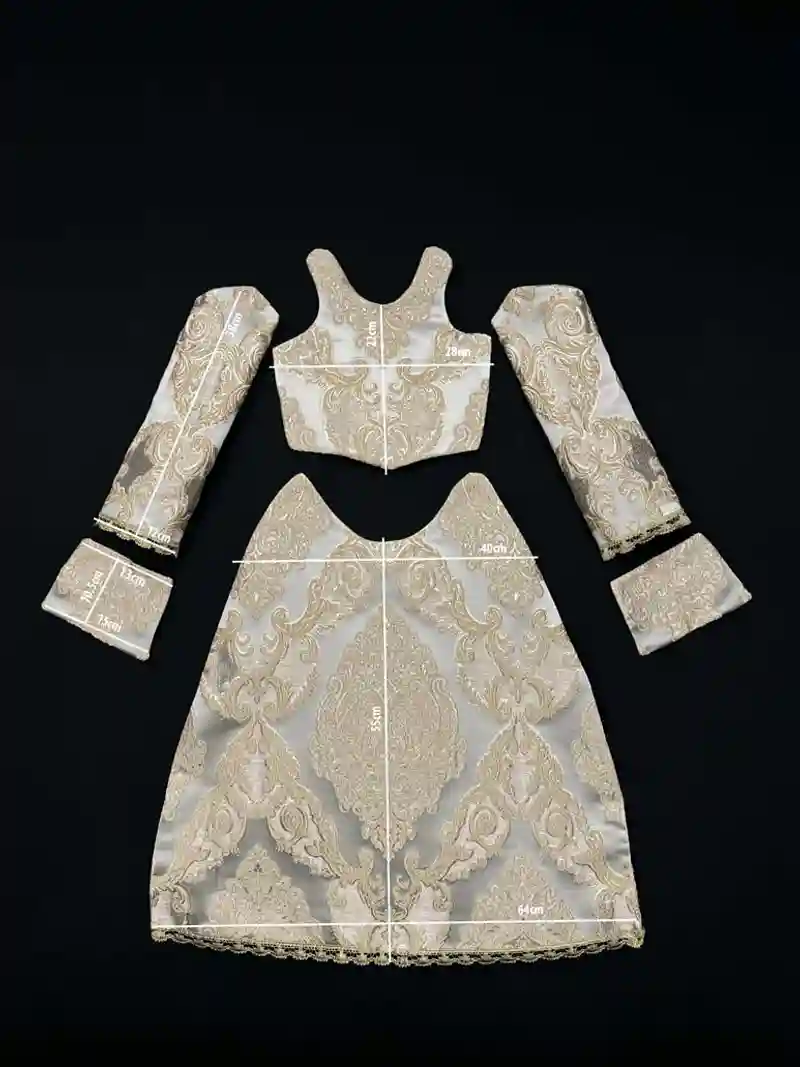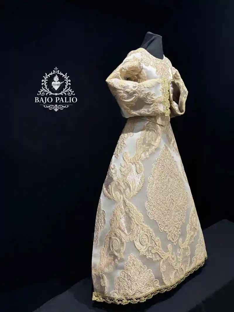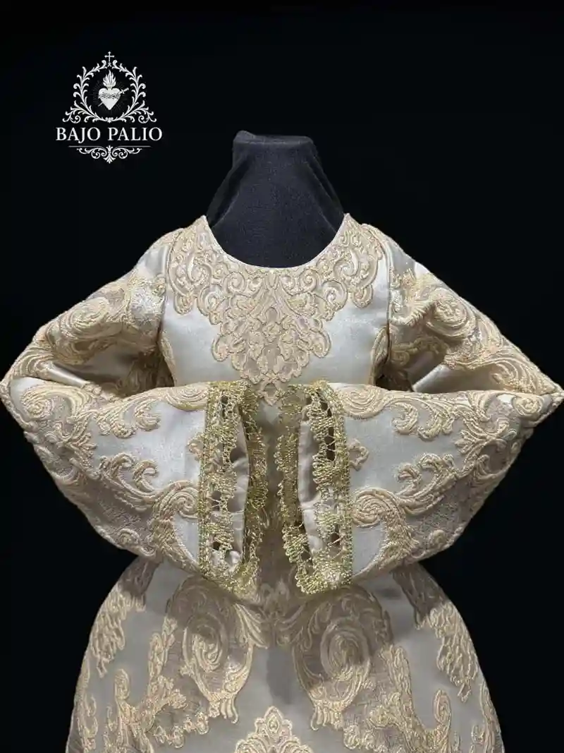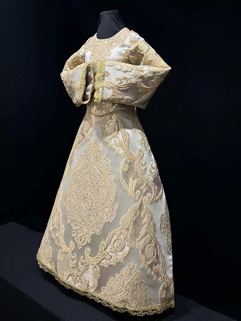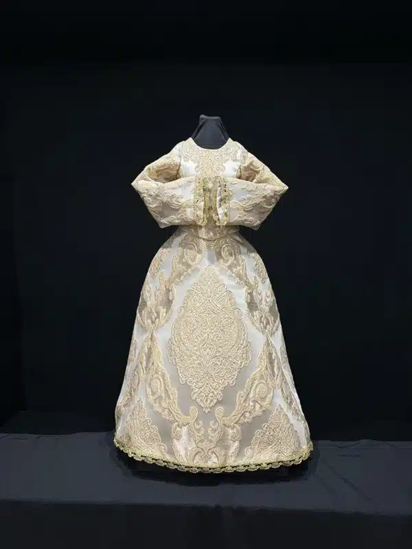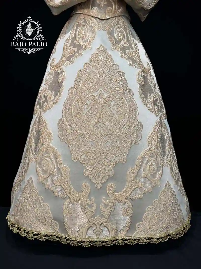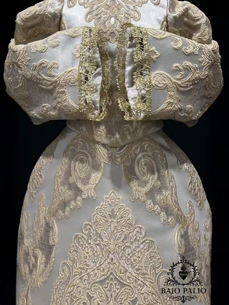 Esta saya es un conjunto pensado para que cada elemento case perfectamente con el resto. Confeccionada íntegramente en nuestro taller con el espectacular brocado Aurora, donde buscamos siempre la mejor posición del dibujo para que visualmente quede centrado y acorde.