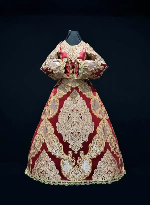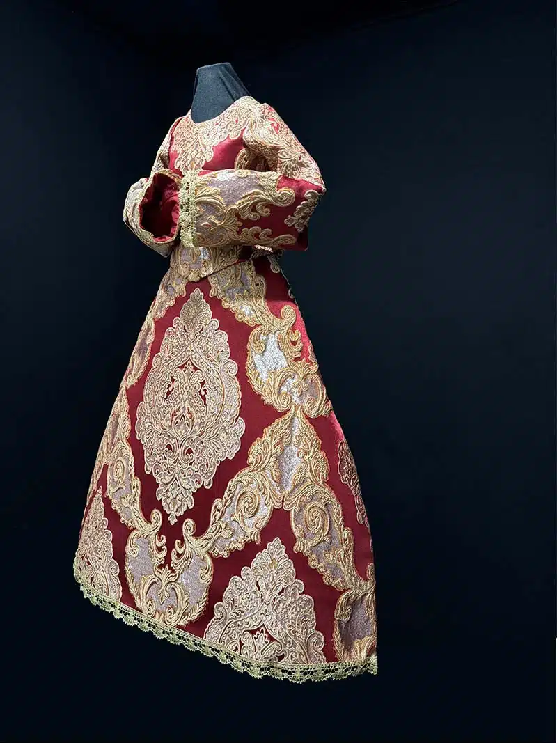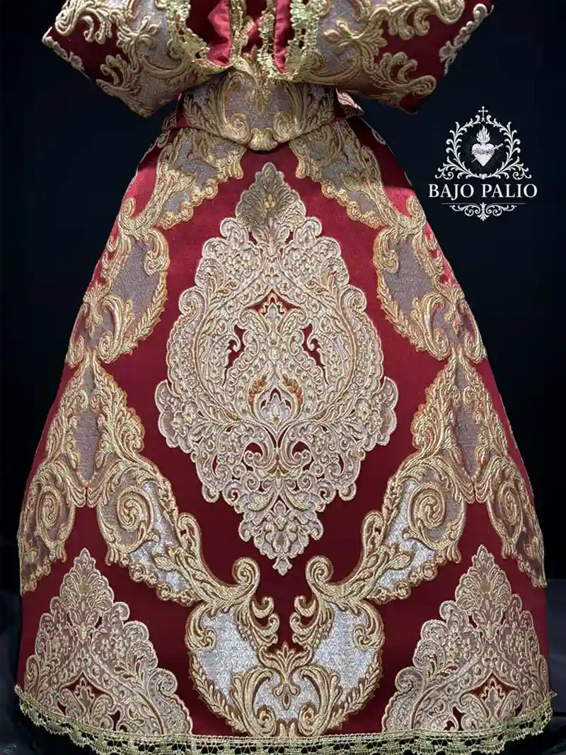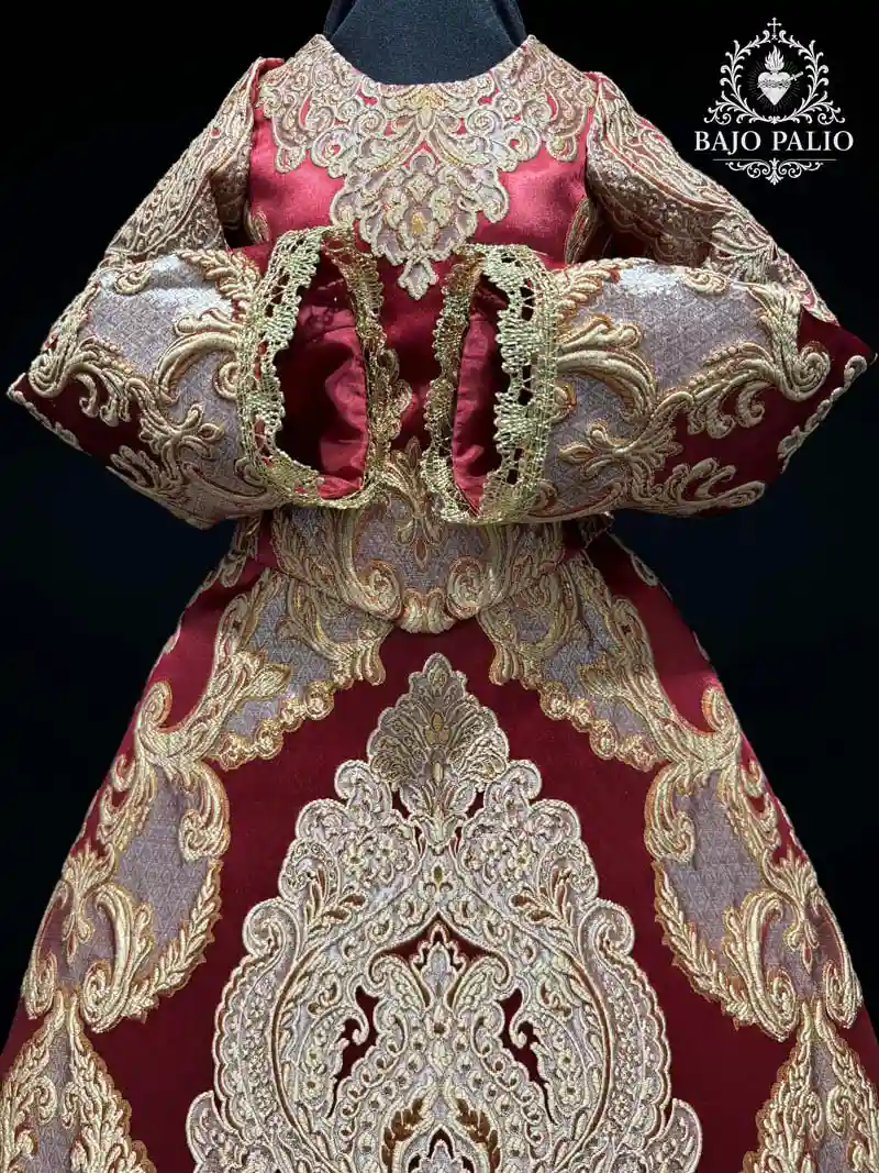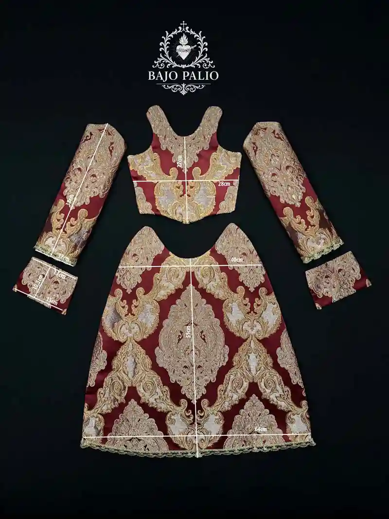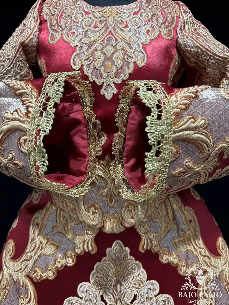 Esta saya es un conjunto pensado para que cada elemento case perfectamente con el resto. Confeccionada íntegramente en nuestro taller con el espectacular brocado Aurora, donde buscamos siempre la mejor posición del dibujo para que visualmente quede centrado y acorde.