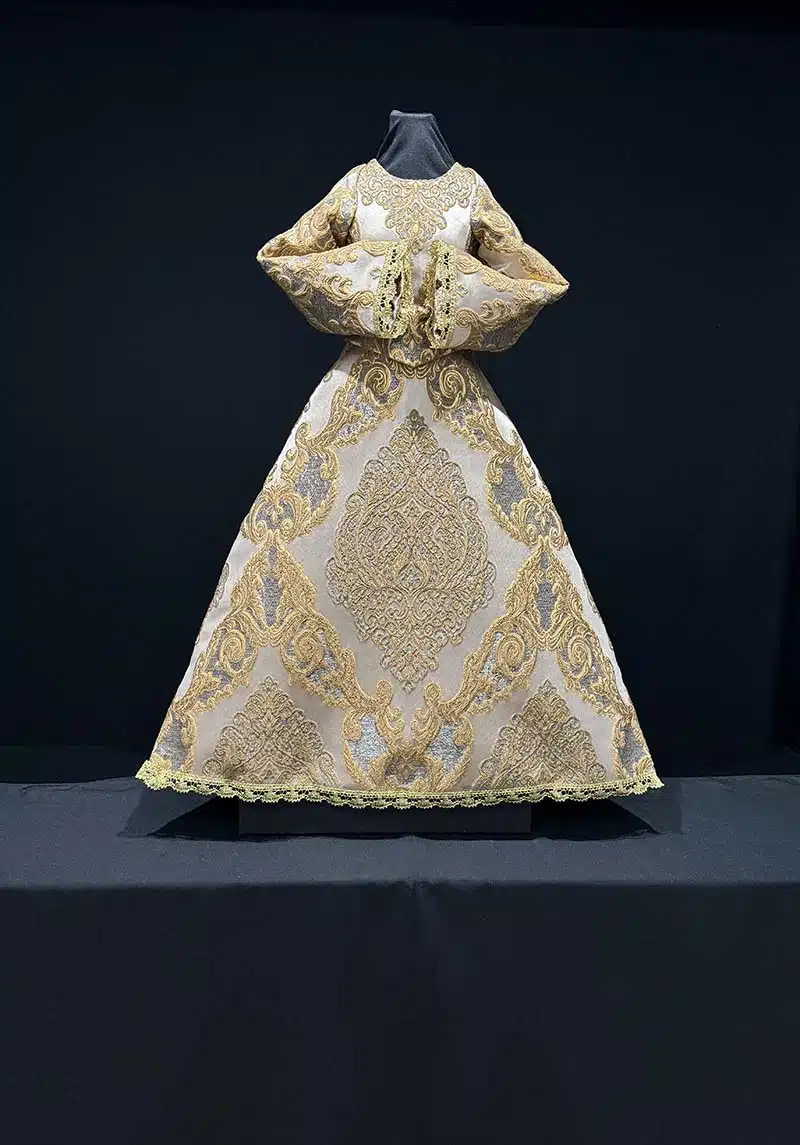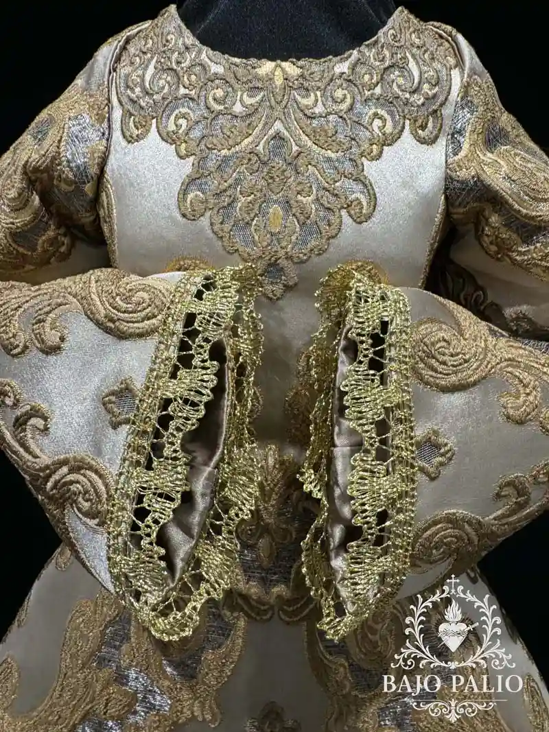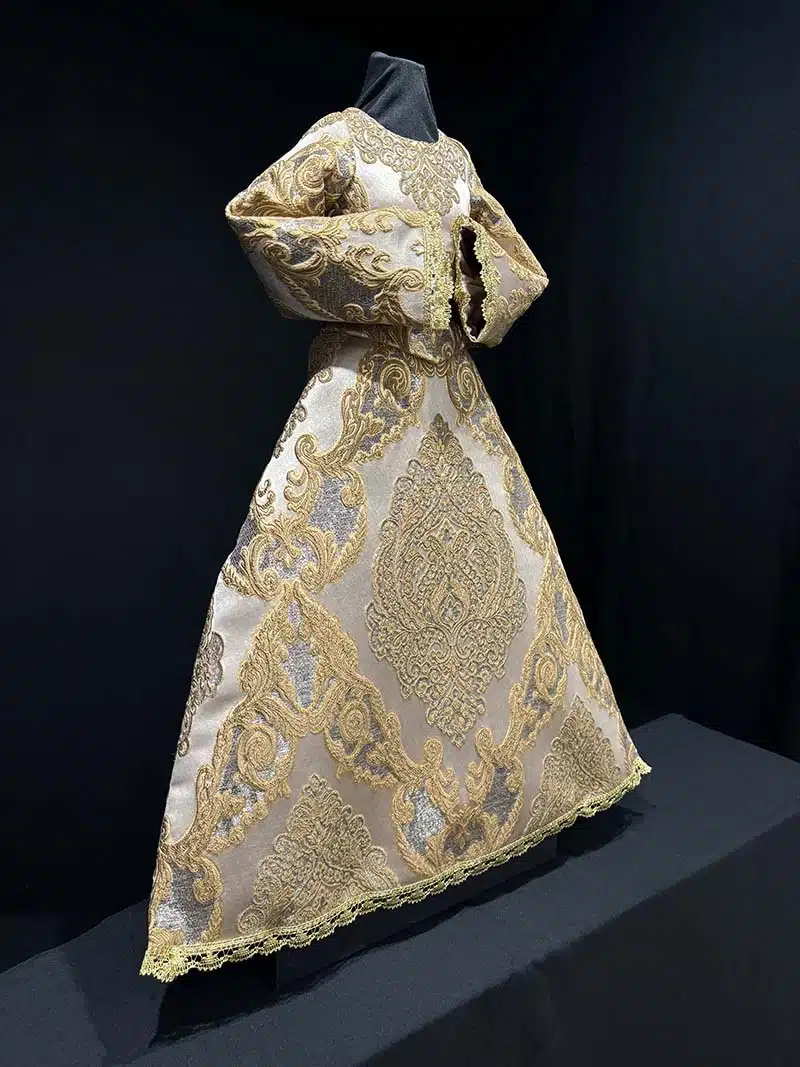 Esta saya es un conjunto pensado para que cada elemento case perfectamente con el resto. Confeccionada íntegramente en nuestro taller con el espectacular brocado Aurora, donde buscamos siempre la mejor posición del dibujo para que visualmente quede centrado y acorde.
