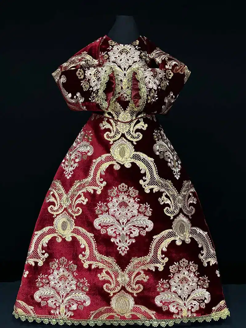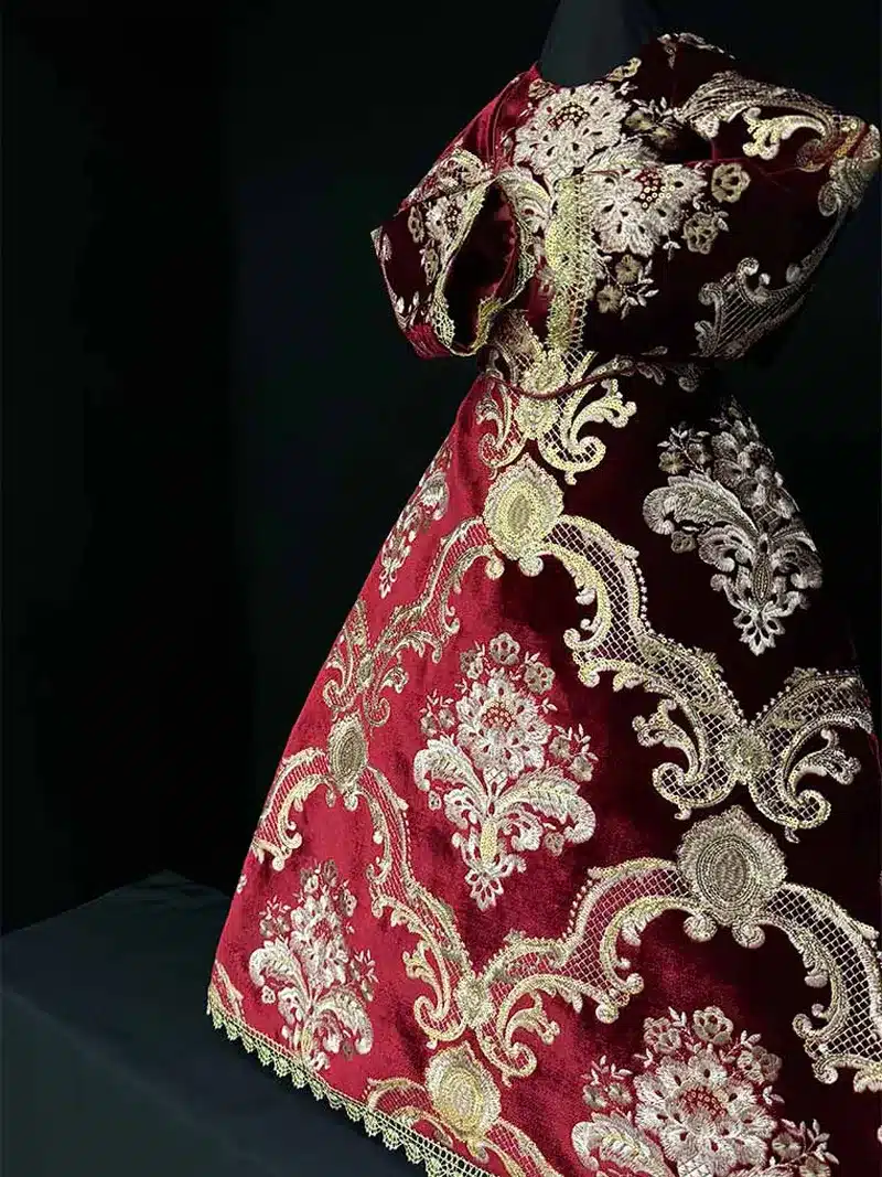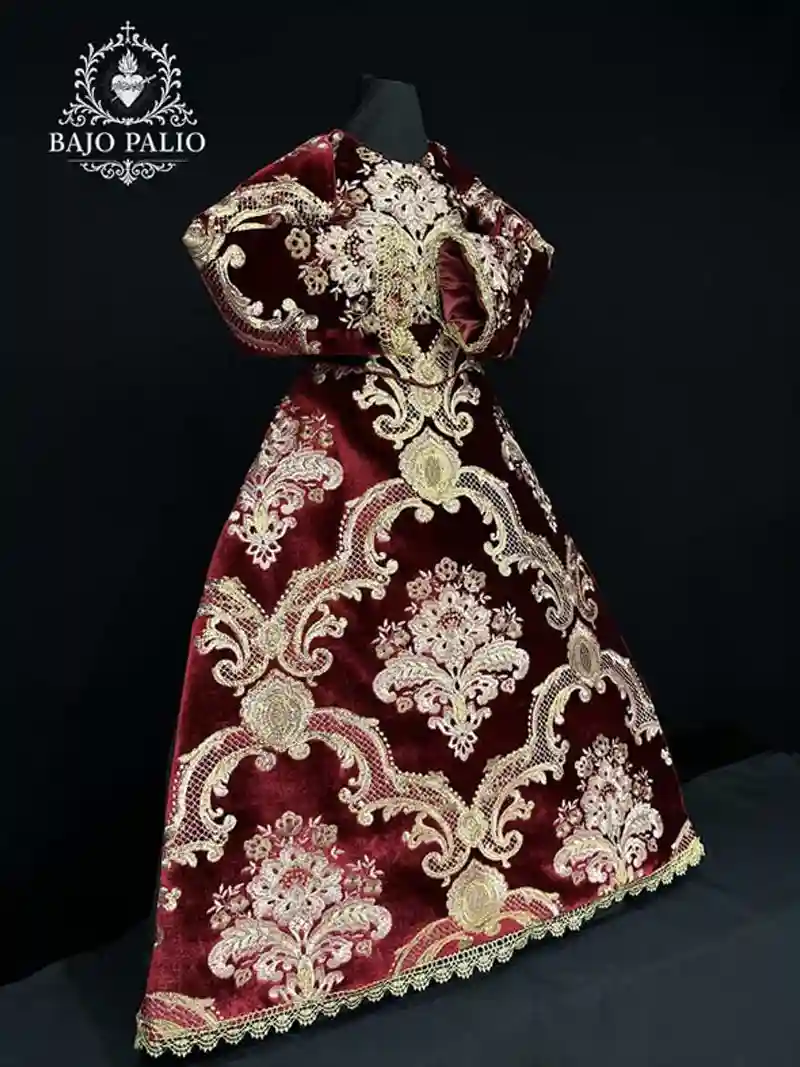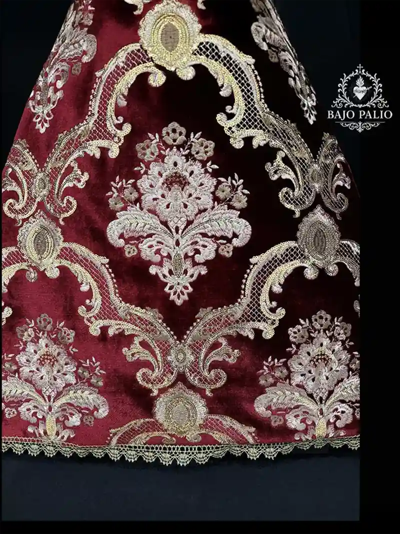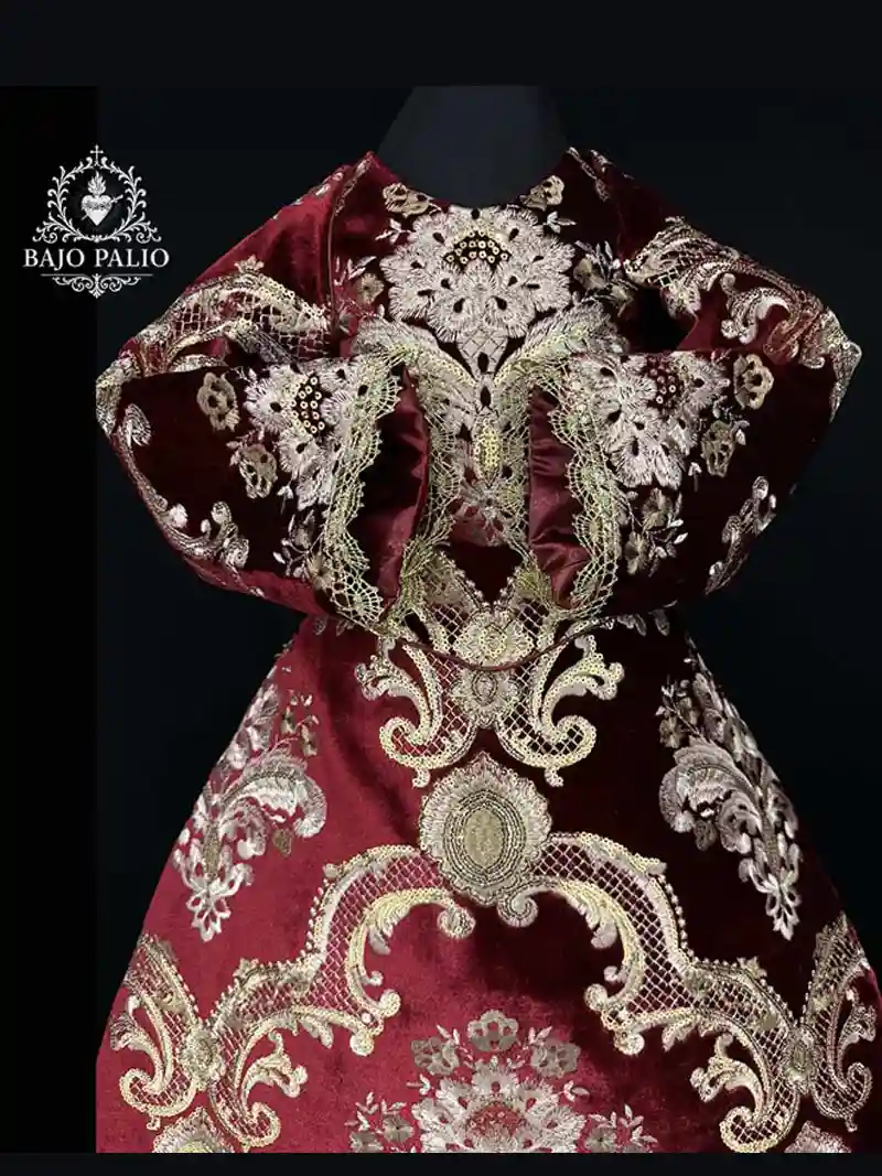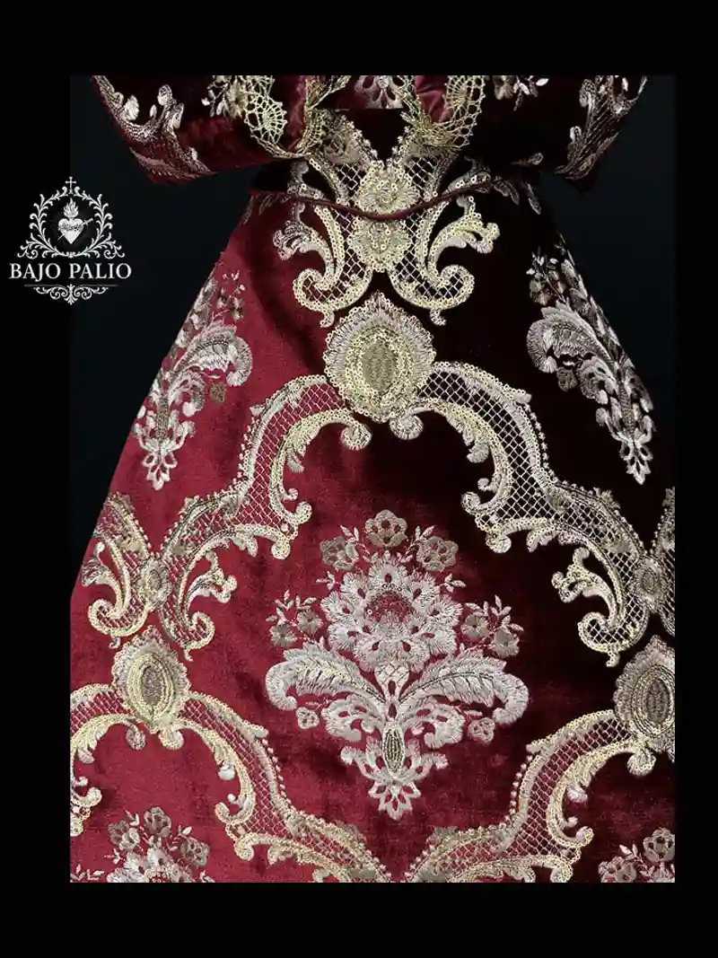 Esta saya no es solo una pieza, es un conjunto integral confeccionado en nuestro taller con el espectacular terciopelo bordado Estrella.
