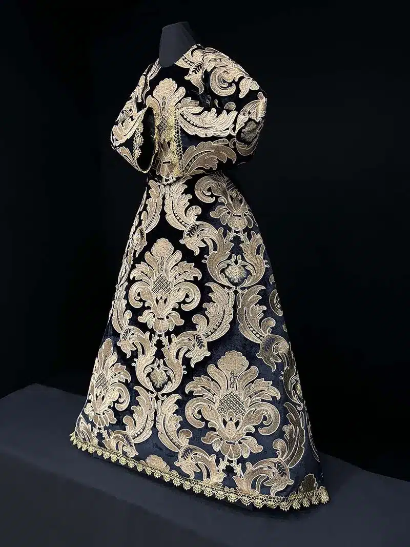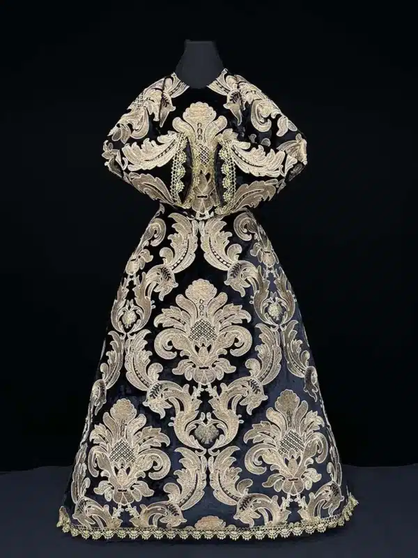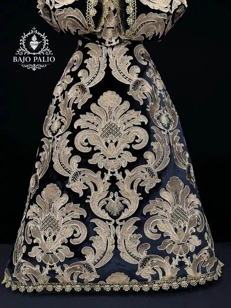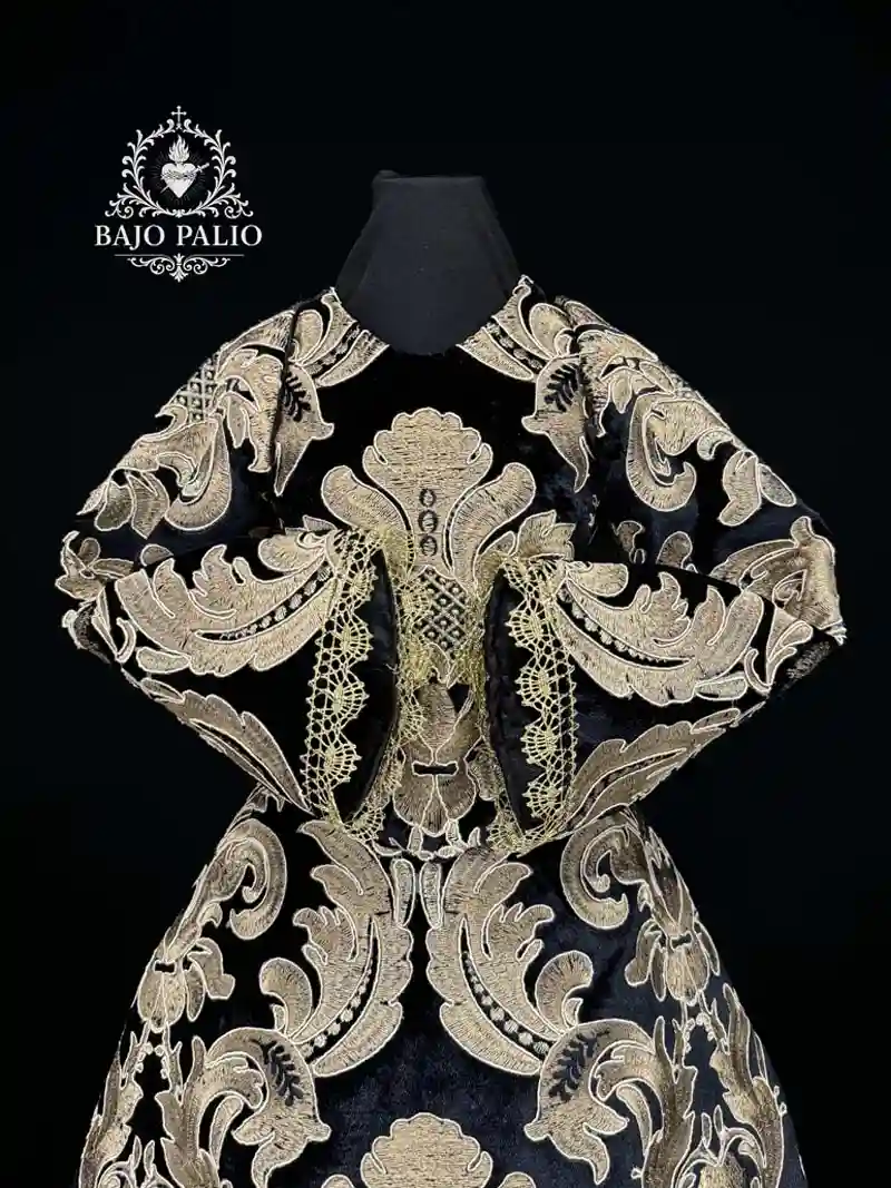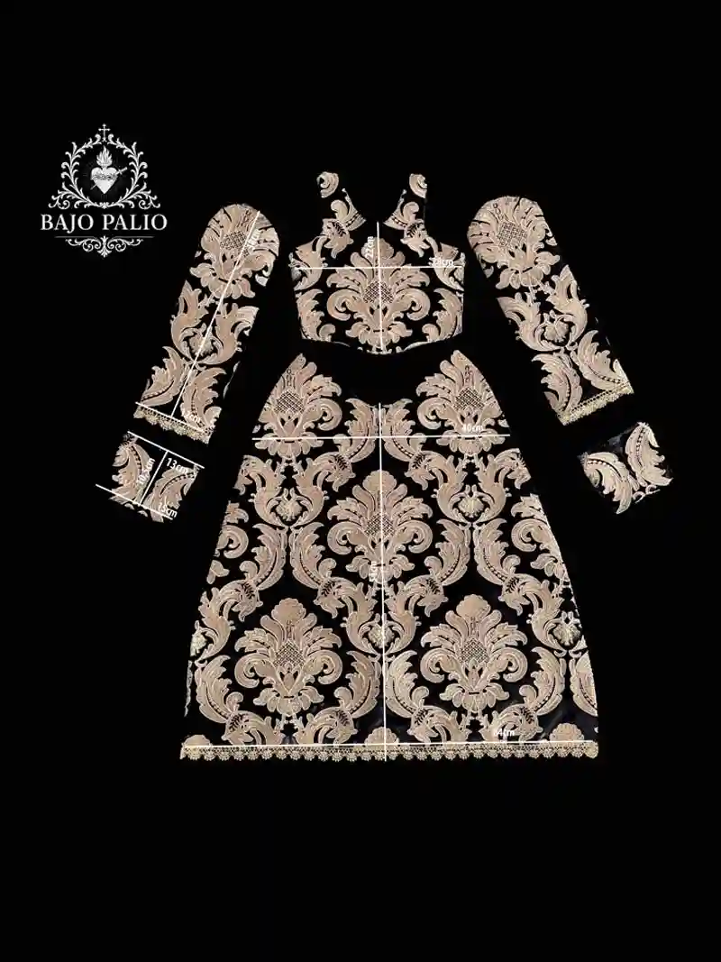 Este conjunto de cuatro piezas está confeccionado en nuestro taller con el terciopelo bordado Rosario, un tejido con cuerpo y firmeza que aporta carácter a la vestimenta. Bordado industrial en hilo dorado con bordes en canutillo beige y detalles en hilo metalizado, todo rematado con forro de raso y encaje de concha dorado.