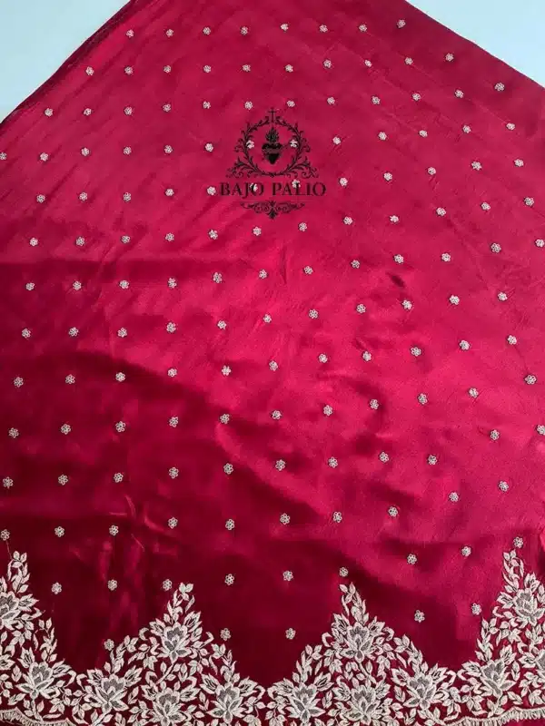 Espectacular pieza de Tejidos bordados seda burdeos, con forma semicircular con el bordado principal en el borde del semicírculo. En el resto del tejido, lleva pequeñas flores bordadas que cubren de forma simétrica el espacio del cuerpo.