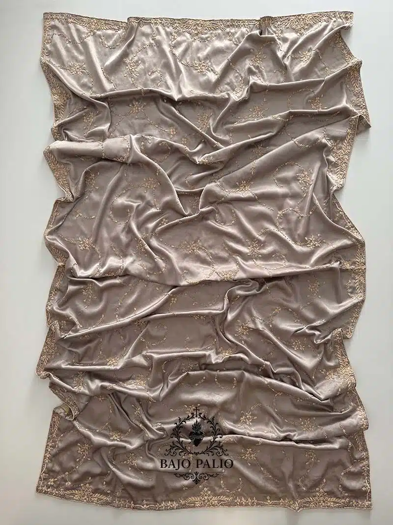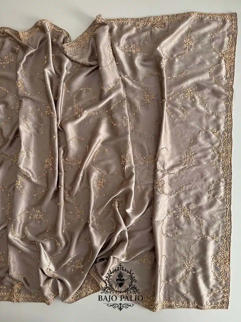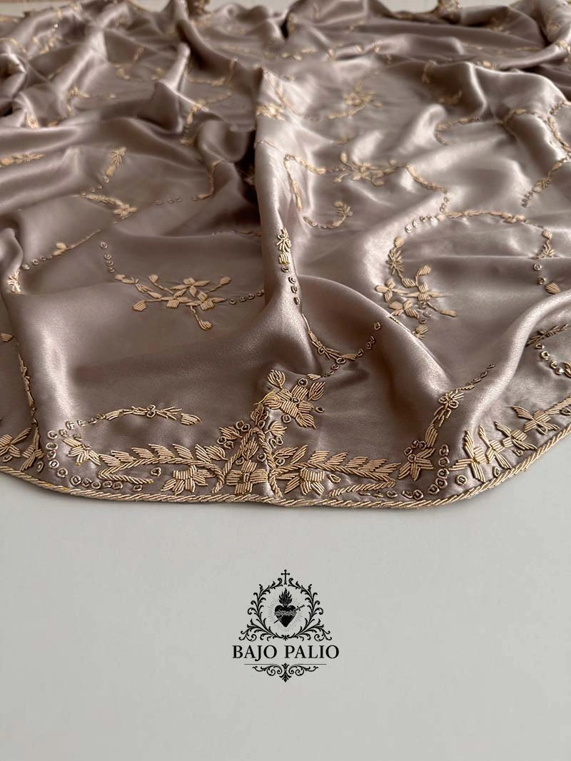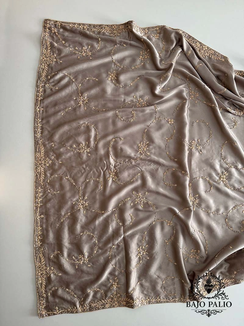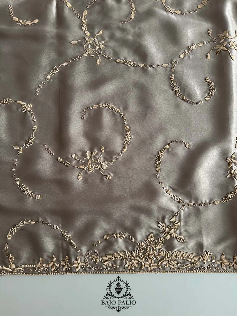 Aquí presentamos Tejidos Bordados Seda Gris Rosáceo, un espectacular bordado que está realizado a mano con piezas en canutillo y pedrería.