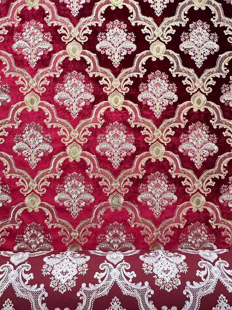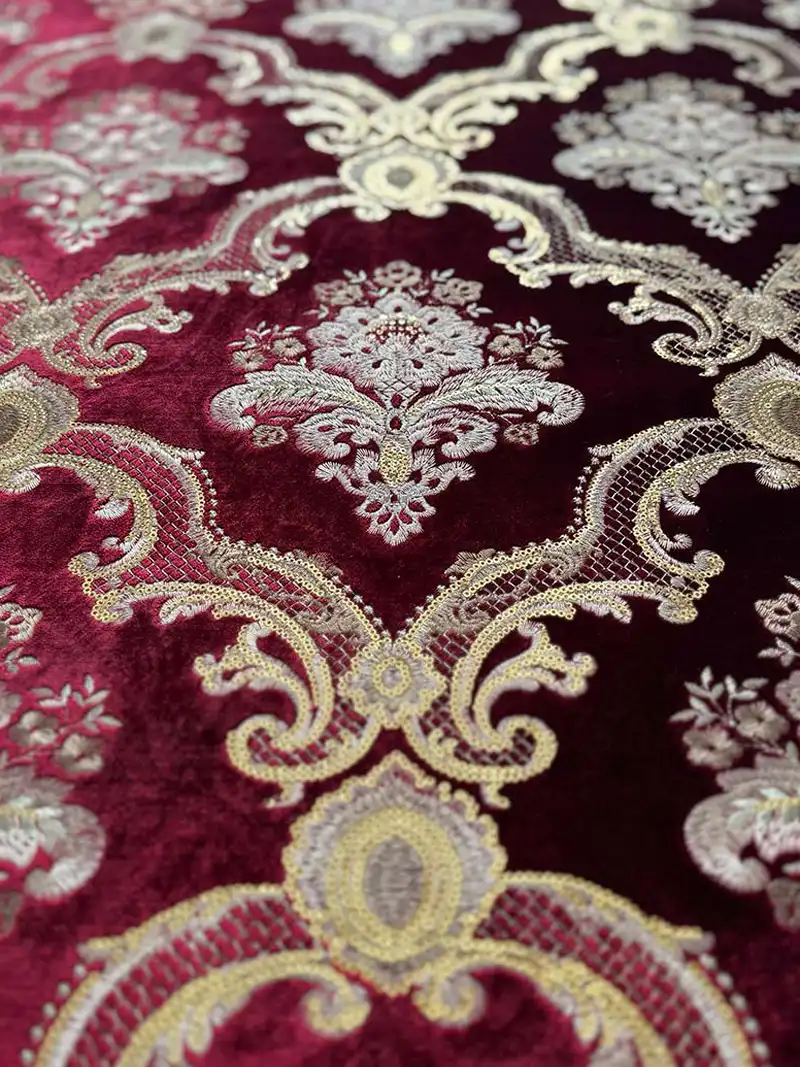 Este terciopelo sintético con bordado industrial de estilo barroco combina ramillete floral central con un marco ornamental que se sucede a lo ancho del diseño. Las lentejuelas doradas en los bordes y el hilo metalizado verde hoja aportan ese toque especial que marca la diferencia.