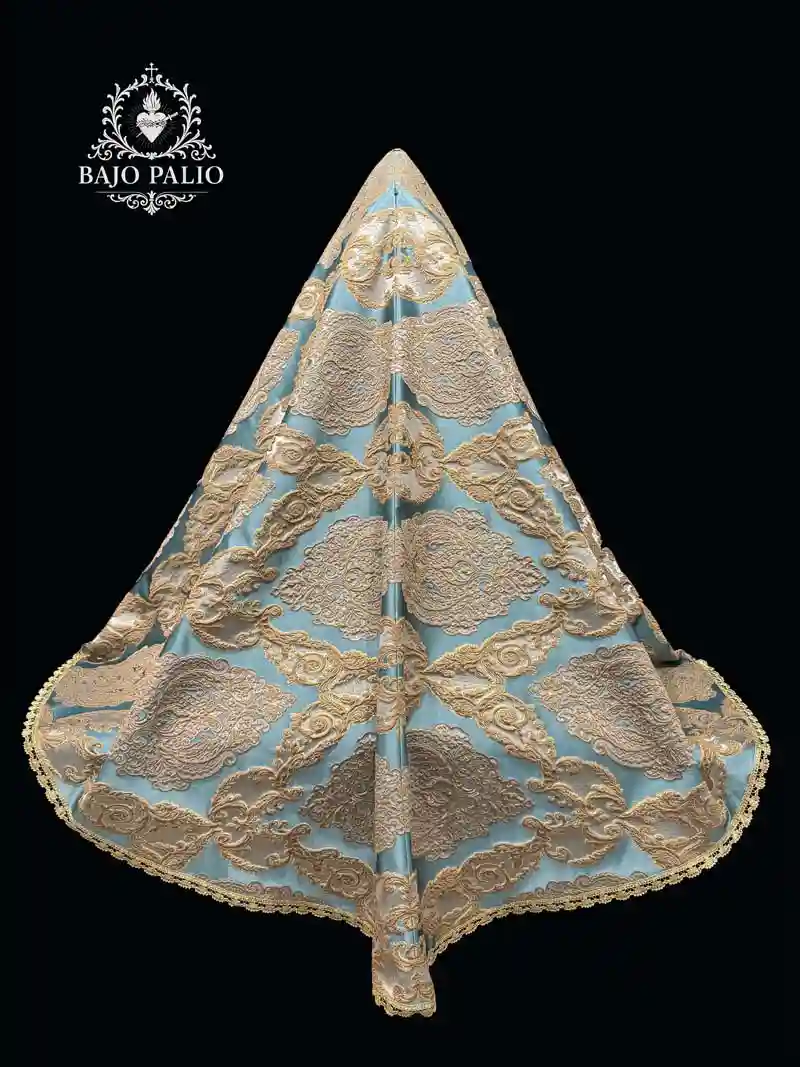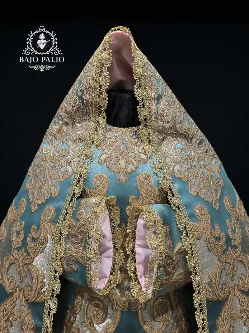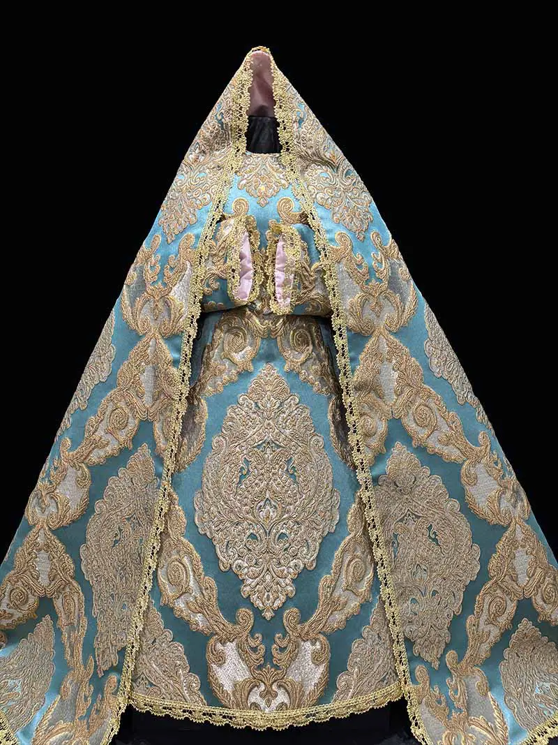 ENCAJE: Concha metalizado de 2cm en todas las terminaciones (mangas, bajo de saya y borde de manto)