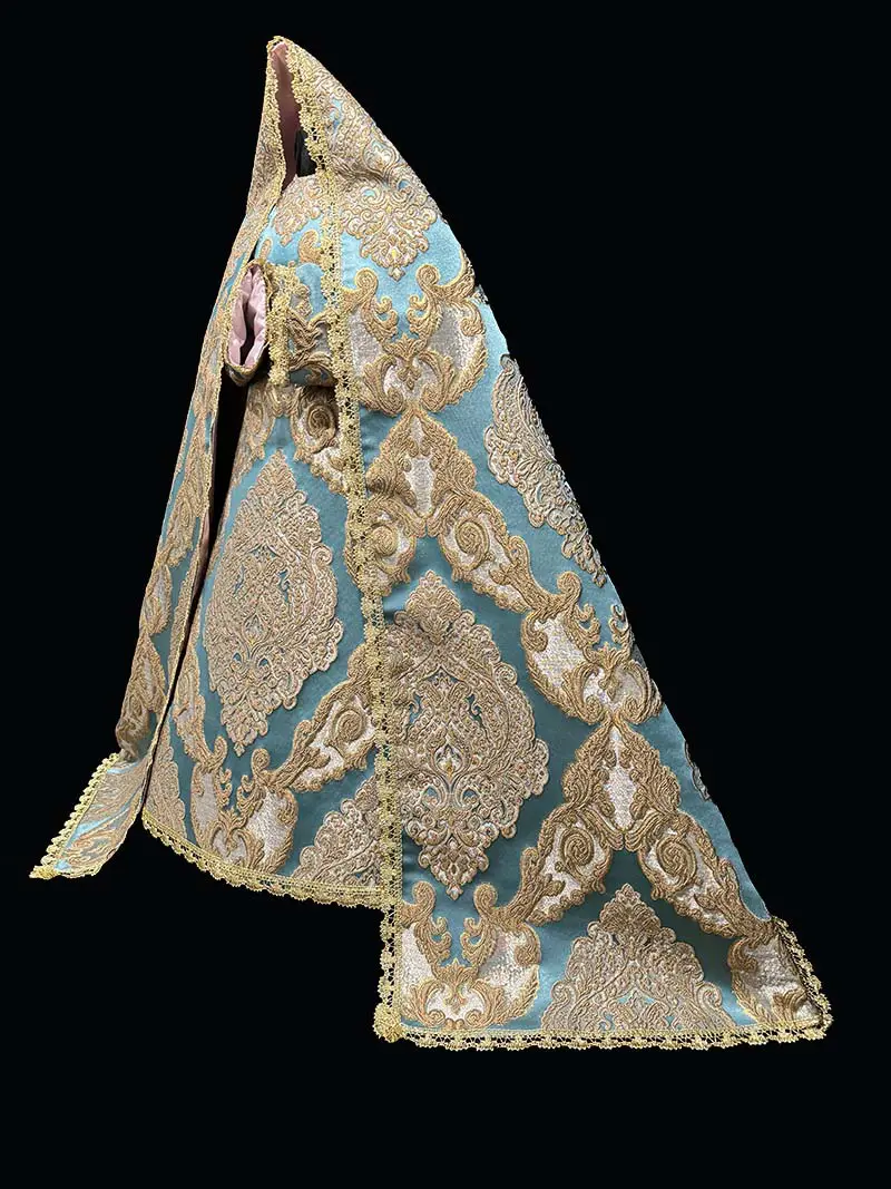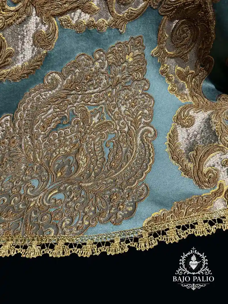 Este terno completo está confeccionado íntegramente con el brocado Aurora azul turquesa, garantizando que cada pieza case perfectamente con las demás.